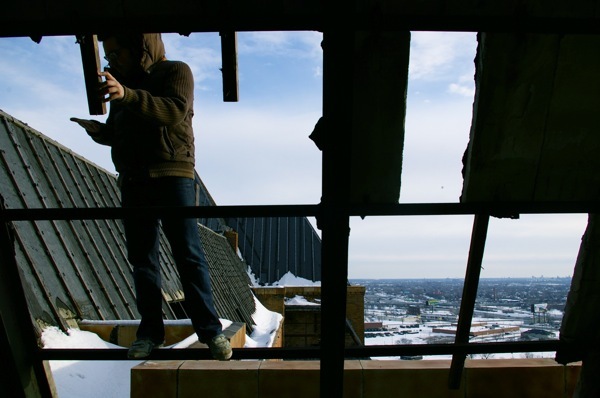 Then we went up to the top of the building, which required the 12 of us going in a single-file line with all of our stuff up like 10 flights of stairs littered with rubble and debris, with a single flashlight. Pieces of ceiling would sporadically fall on our heads, and the railing of the staircase was unsteady at best.