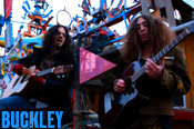 Unlike the chants of his childhood, Szylak watched as The Satin Peaches' songs transformed his conglomeration into a living and breathing circus. The drum's patter gave the impression of being trapped in a pinball machine. Surrounded by ridiculous and garish gnome-like sculptures and cadmium yellow picket posts, the clacking drum beats had no break and danced around kissing horses, ricocheting off of weathered wood and finally escaped laughing all the way down the alley. But the sounds did not run free without bringing attention to themselves and their origin. Curious gawkers slowly started to emerge from neighboring houses and garages. Initially I wondered how many more songs we could get out of the band before they called the cops on us. After they flagged down one of the crewmembers we realized it was only because they wanted us to "Turn it up!" With a smile on Szylak's face and having given his neighbors a dose of Rock n' Roll, we went on with the performance.